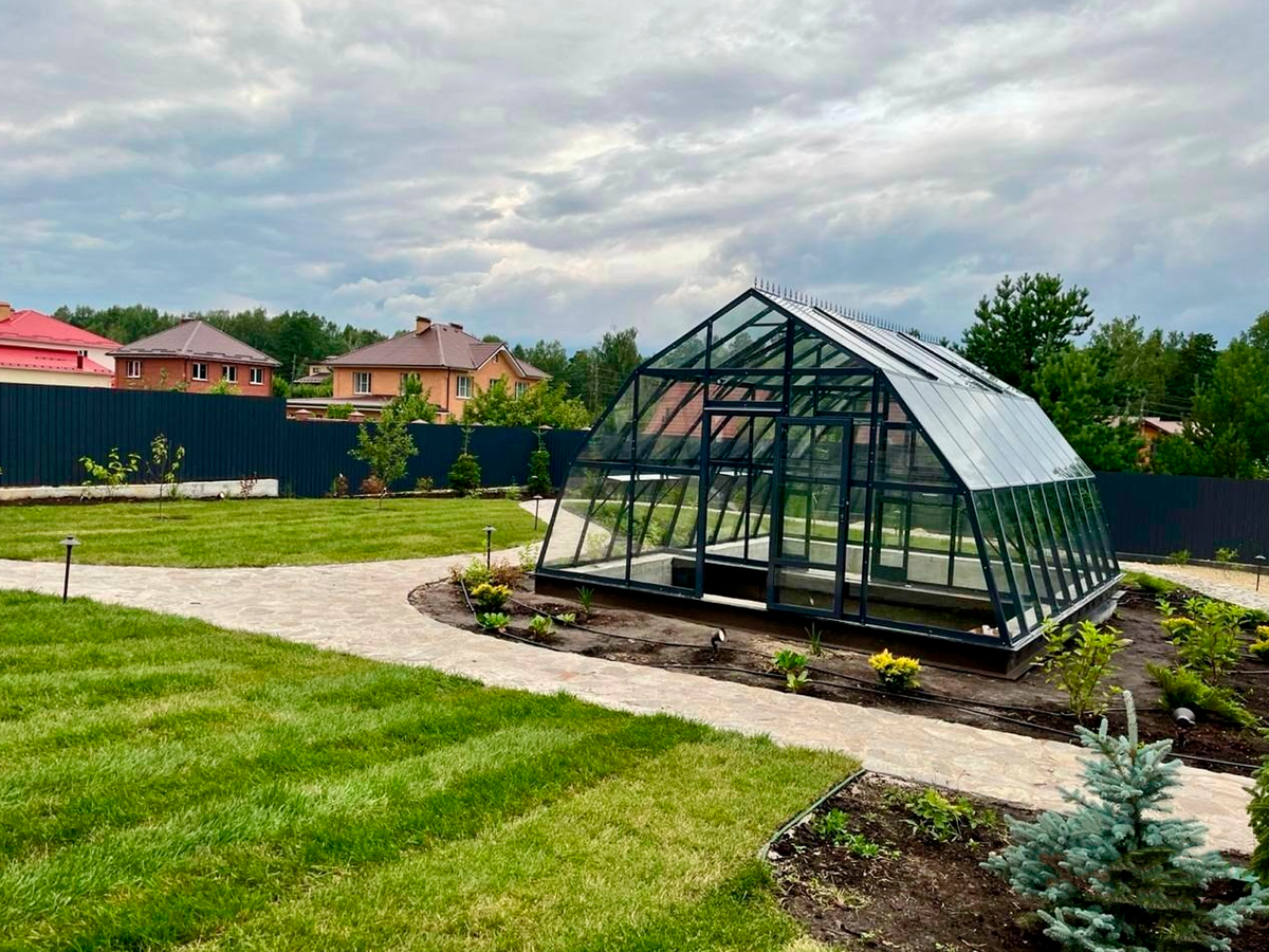 - Что за теплица: представитель классических английских теплиц — сбалансированные пропорции и аккуратная форма.
